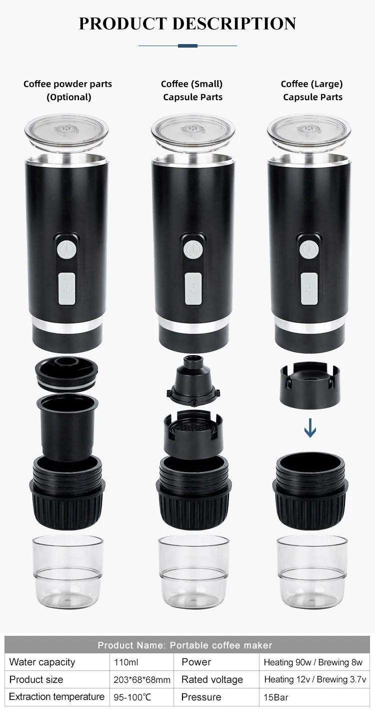 This portable coffee maker is used for both capsules and powder, without heating function, and needs to heat water.
